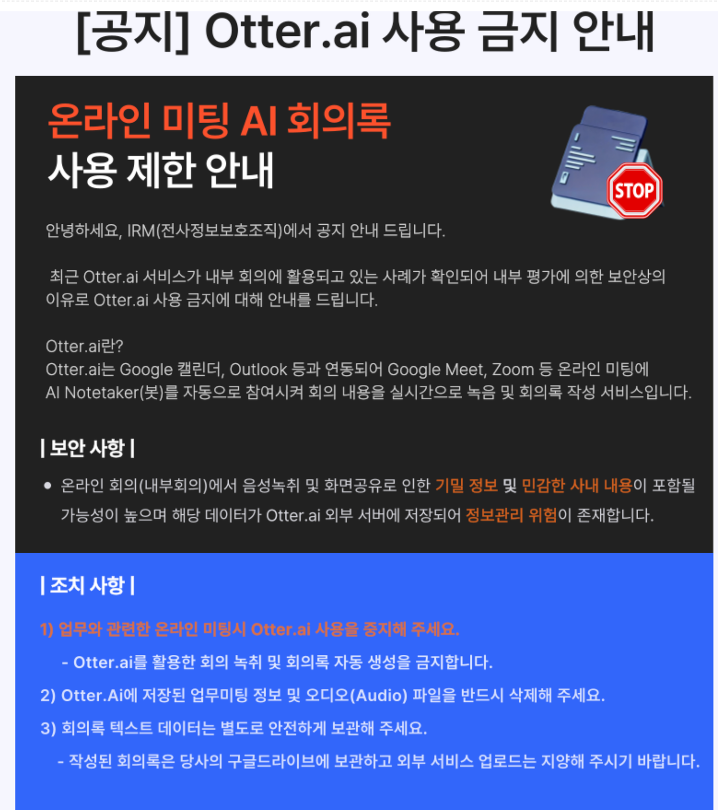 최근 회사 내부에서 보안상의 이유로 외부 API 기반 회의록 생성 서비스(예: Otter.ai, Notta 등)를 사용 제한하는조치가 있었습니다. 특히 중요한 고객 미팅, 전략 회의 등은 외부로 관련 데이터가 유출되는 것을 엄격히 제한하고 있습니다.